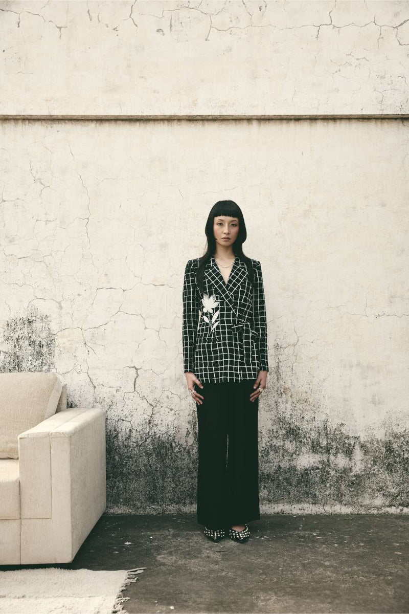 This tailored black jacket is screen printed with an off-white grid that feels sketched rather than measured—lines intersecting with a quiet sense of movement. A single floral motif breaks through the geometry, softening the structure like a thought drifting off course.