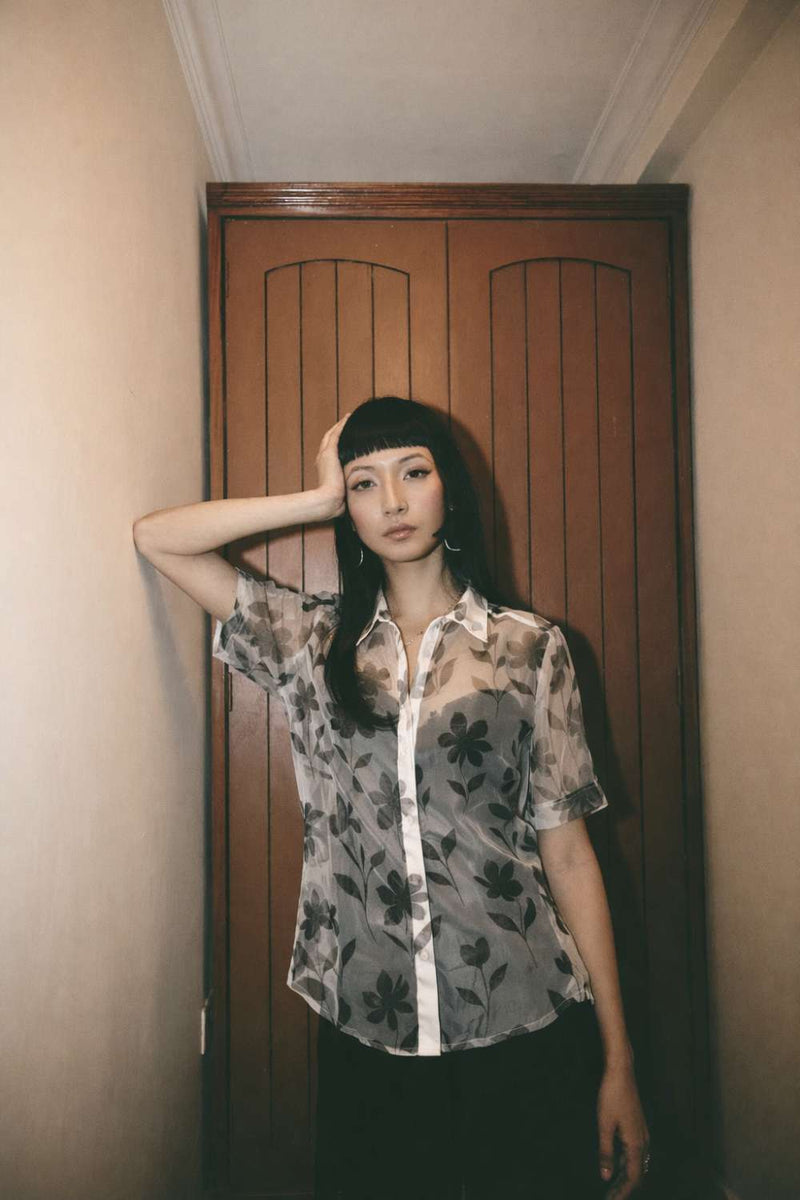 This sheer organza shirt is an exercise in softness and restraint. Crafted in translucent organza, it carries delicate black floral forms that seem to float rather than sit—light, airy, and almost fleeting. The florals feel hand-drawn, like impressions left behind rather than statements made.