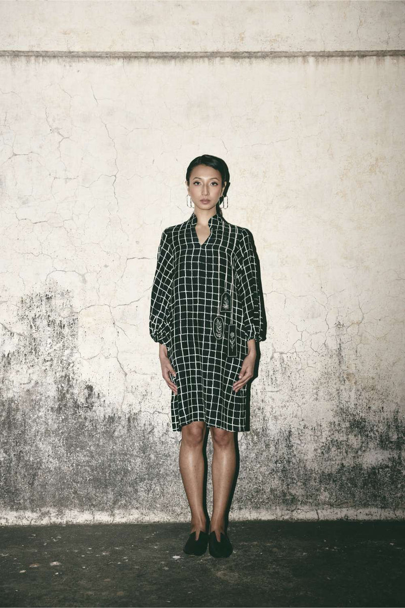 This black dress is crafted with a fine off-white grid that feels precise yet gently imperfect, like lines drawn and redrawn on a familiar page. The straight, relaxed silhouette is balanced by soft volume through the sleeves, creating an easy structure that moves without effort.