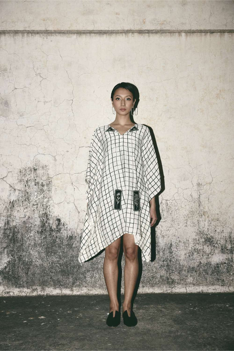 This off-white dress features a hand-drawn black grid that feels like lines sketched freely across a notebook page. The relaxed, poncho-style silhouette moves with ease, creating gentle volume and soft structure in equal measure.