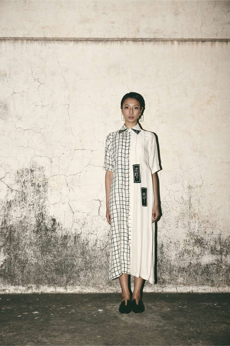 This midi-length shirt dress brings together two visual languages in quiet balance. One side unfolds in an off-white grid, precise yet hand-drawn in feel, while the other remains fluid and uninterrupted, allowing the fabric to fall freely. The contrast is subtle, intentional—never abrupt.