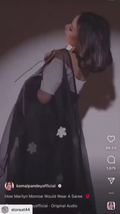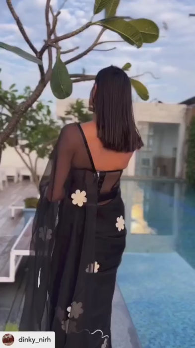An organza saree to die for! This drape has hand embroidered geometric flowers all over the saree, continued till the pallu. A simple yet elegant saree for evenings, brunches, luncheons, and parties. We have styled this with our classic corset top.