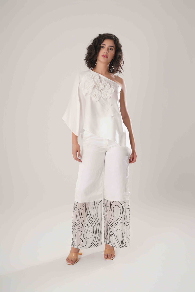 Make an effortlessly bold statement with this asymmetric off-shoulder top, crafted in smooth modal satin for a luxurious drape and soft sheen. The structured yet fluid silhouette falls elegantly over the shoulder, while handcrafted floral appliqués adorned with pearl accents add an element of intricate detailing. A timeless piece that blends minimalism with striking artistry, perfect for both contemporary and festive styling.