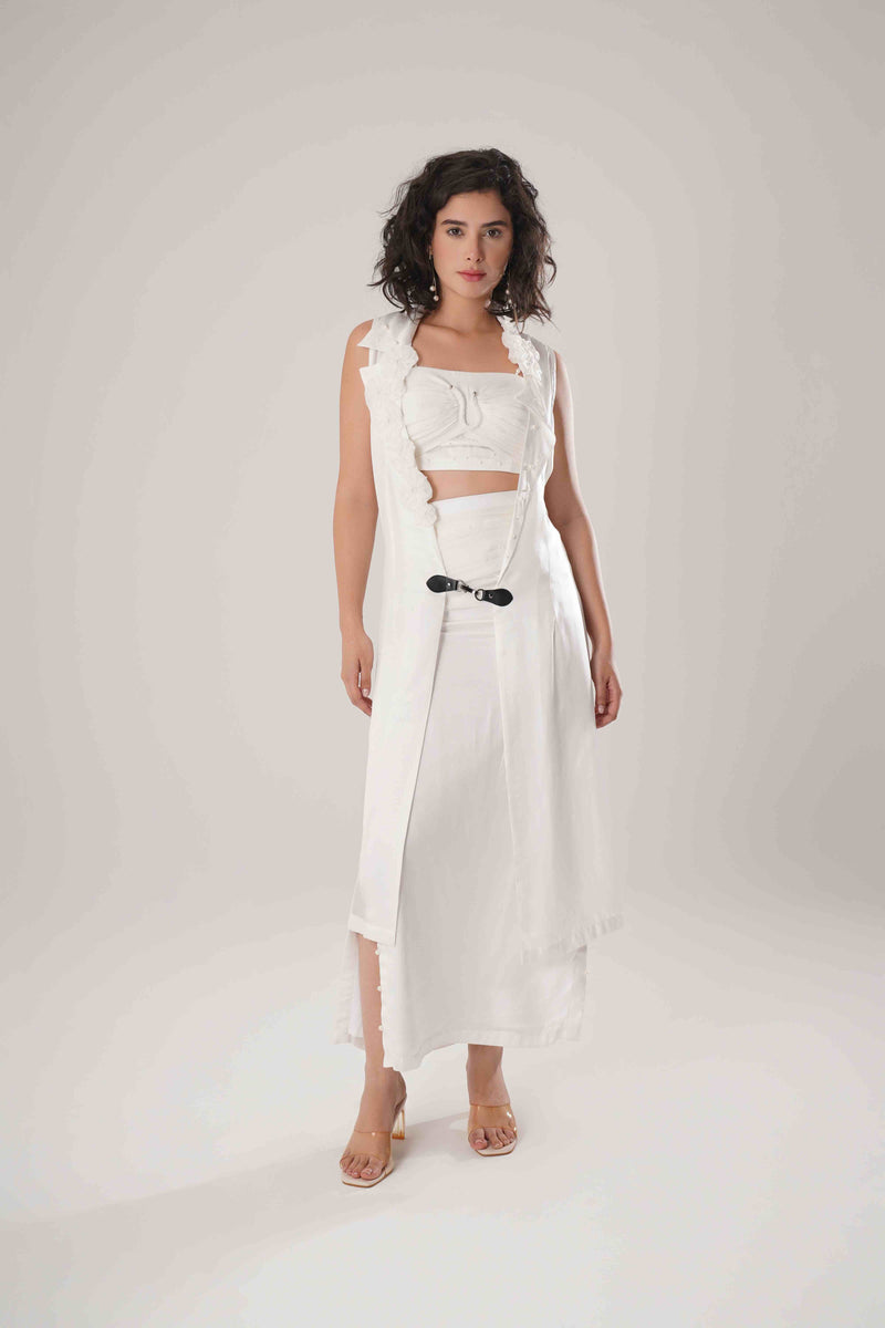 A contemporary take on classic layering, this sleeveless summer trench is crafted from luxurious modal satin, offering a smooth, fluid drape. Designed for both structure and movement, it features a buckle closure at the front, allowing for versatile wear. The statement lapels are adorned with handcrafted floral appliqué and pearl embellishments, adding depth and elegance to the design. The back panel showcases intricate embroidery, creating a striking contrast of textures.