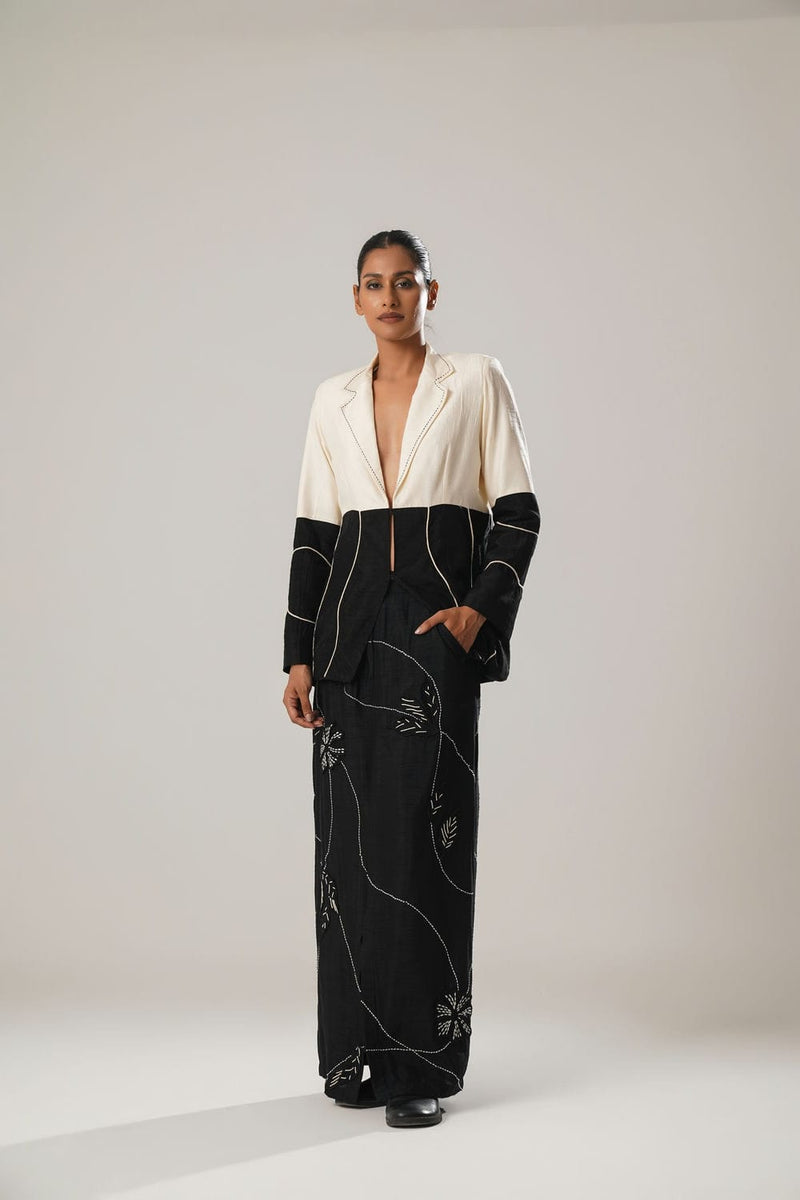 Step out in elegance with our Black Long Skirt, crafted from luxurious raw silk satin. This skirt features exquisite handcrafted flowers enhanced with traditional kantha detailing, adding a touch of artisanal charm. The front zip closure ensures a secure fit, while the bottom slit offers a modern twist and ease of movement. Perfect for both formal and festive occasions, this skirt combines sophistication with contemporary style.