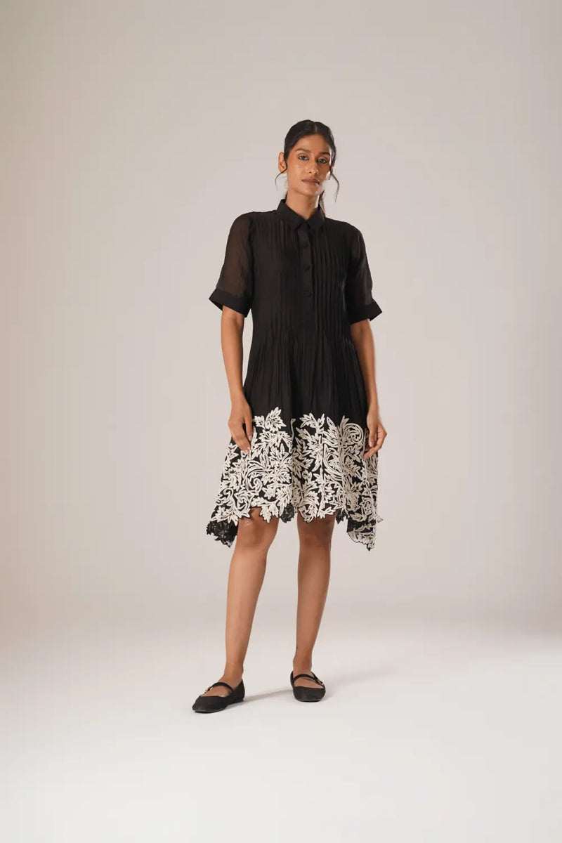 A classic with a twist. This buttoned black short dress is cut in sheer handloom chanderi with soft pleating through the body for a flowy, flattering fit. The hemline bursts into intricate off-white botanical embroidery—like a garden growing from within. Part playful, part poetic.