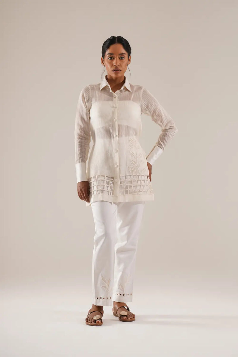 Rooted yet weightless—like something glimpsed through an open window. These narrow-leg pants are cut from soft cotton satin, featuring minimal floral threadwork and delicate square cut-outs along the hem. Light, versatile, and made to pair with moments of pause.