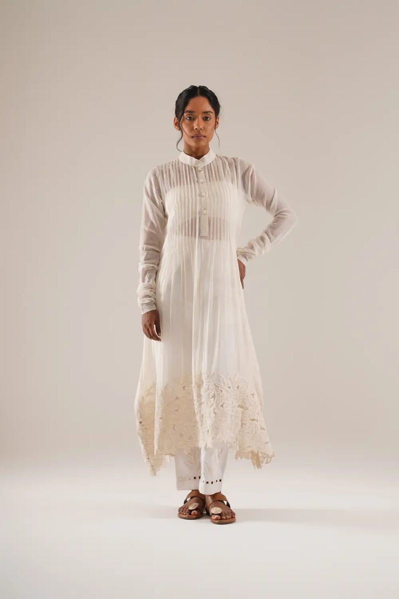 A vision in off-white, this flowing kurta is crafted in sheer Chanderi with a delicate cotton slip. Featuring fine pintucks on the bodice, hand-embroidered floral motifs at the hem, and fabric buttons on the placket, it’s a piece that balances structure with softness. Its fluid silhouette adds a sense of ease, while the intricate cutwork brings in quiet luxury.