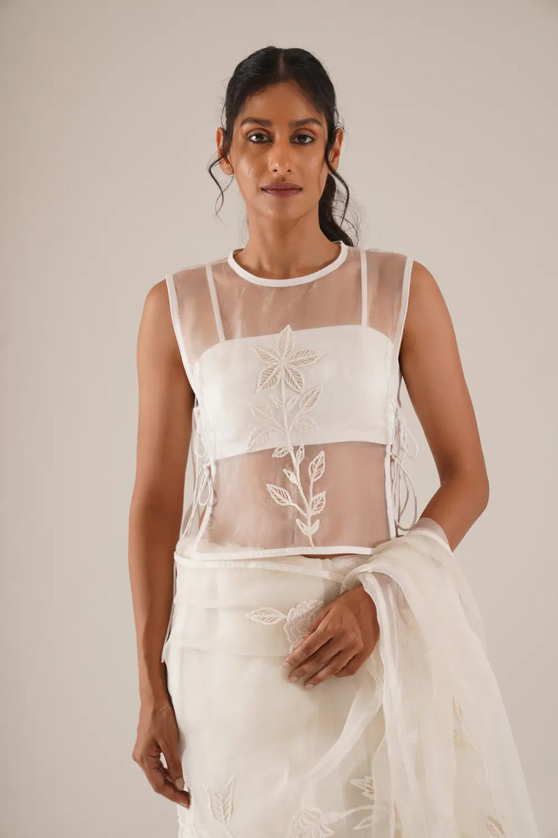 Delicate yet defined, the Tendril Thread Blouse is a sheer sleeveless beauty crafted in organza and cotton satin. With botanical threadwork blooming at the center and a fitted structure held together by side ties, it’s a modern heirloom—subtle, sultry, and serene all at once. The contrast of transparency and intricate embroidery celebrates softness with strength.